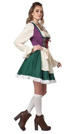 Prost! Raise your glass to bountiful beer carrying babes in this Steph Hefeweizen costume featuring a purple and green German dress with lace-up bodice, a flared A line skirt with a wraparound waist belt, an attached apron, a ruffled hemline, and a cream peasant top with long sleeves and flared cuffs. (Necklace, flowers, basket, knee high socks, and shoes not included.)
