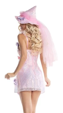 Look absolutely bewitching in this Sweet Witch costume featuring an iridescent sequin dress with underwire cups, adjustable spaghetti straps with ruffled detailing, allover purple flower appliques, a pink satin waistband with a bow accent, a back zipper closure, and a matching witch hat. (Broom not included.)