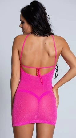 Stand out at the club in this sexy mini dress featuring a sheer bodice with an allover glittery design, a high neckline, convertible spaghetti straps that can be a halter top or shoulder straps with a tie back closure, and a curve hugging skirt. (G-string not included.)