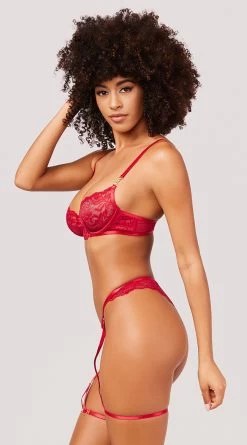 Spice up your evening in this exclusive bra set featuring sheer lace underwire cups, adjustable spaghetti straps with gold detailing, a hook and eye back closure, and a matching panty with a front keyhole opening, a cheeky cut back, removeable adjustable garter straps, and adjustable leg garters.