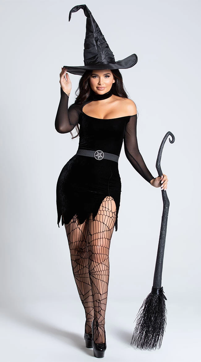 You’re immoral, yet playfully mischievous. Ride away on your broom in this exclusive Black Hearted Witch costume featuring a velvet dress with a cut-out neckline, sheer mesh long sleeves with finger holes, a jagged hem, a black waist belt with a pentagram symbol, and a matching witch hat. (Broom not included.)