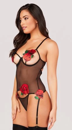 Tempt and tease in this exclusive mesh teddy featuring open underwire cups with strappy detailing, red rose appliques, adjustable spaghetti straps, a sheer bodice with a front cut-out, an open back panel with a hook and eye closure, adjustable garter straps, a back keyhole opening, and a thong cut back. (Thigh high stockings not included.)
