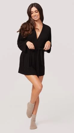 Keep your vibe hot and cozy in this exclusive bralette set featuring soft cups, adjustable spaghetti straps, a smooth back band, a matching high waisted panty with a cheeky cut back, and a matching short robe with long sleeves and a waist tie. (Socks not included.)