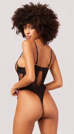 Exude loving vibes in this exclusive teddy featuring sheer mesh underwire cups with red and white heart appliques, a red satin bow accent, adjustable spaghetti straps, a front keyhole opening, a sheer mesh bodice with red and white heart appliques, a hook and eye back closure, a back keyhole opening, and a thong cut back.