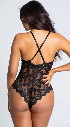 Have all eyes on you in this stunning exclusive romper featuring a plunging V-neckline with a scalloped lace trim, beautiful sheer intricate lace cups, criss-cross adjustable spaghetti straps, a sheer lace bodice, and a cheeky cut back with a scalloped hem.