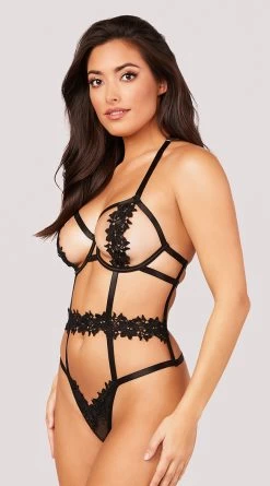 Look hot from every angle in this exclusive teddy featuring open underwire cups with strappy detailing and venice lace panels, adjustable halter straps, a strappy open bodice with a venice lace waistband, adjustable back hook closures, a venice lace racerback strap, a sheer mesh panty panel with a venice lace trim, and a thong cut back.