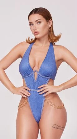 Have all eyes on you in this exclusive Yandy X Lana Rhoades denim bodysuit featuring underwire cups, halter straps, a front keyhole opening, a back hook closure, a slim bodice panel, a light denim waistband with a back hook closure, double gold chain detailing, a back keyhole opening, and a thong cut back.